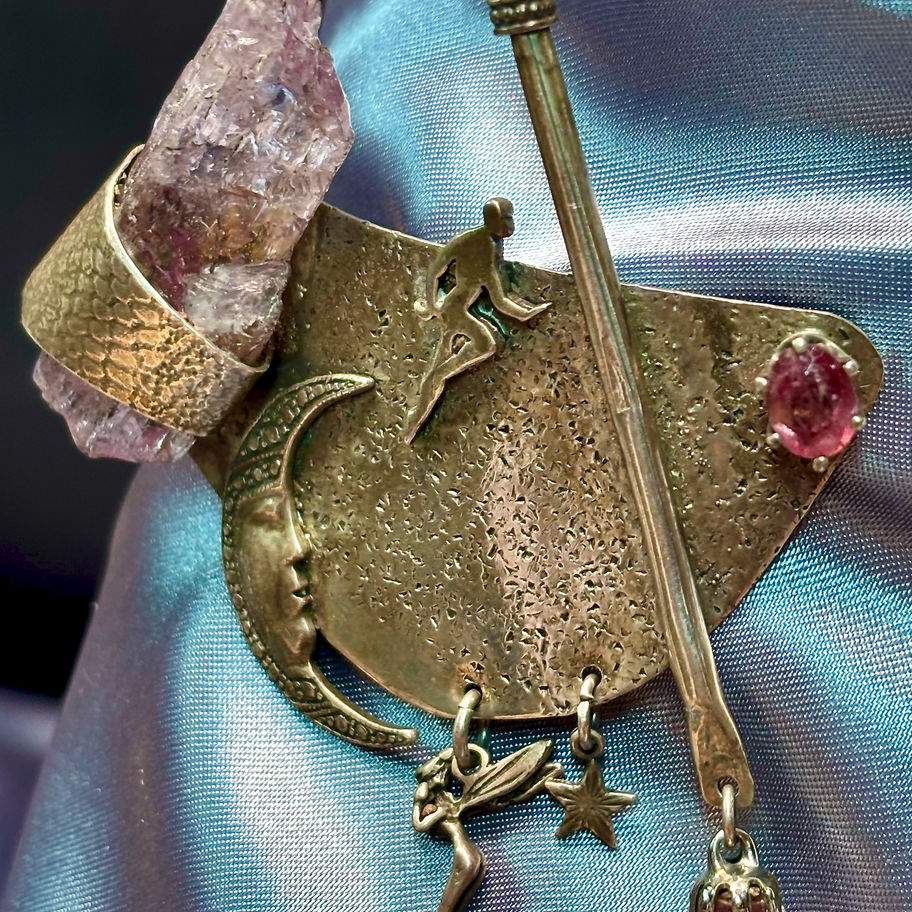 Elevate your accessory collection with this exquisite Kunzite brooch, showcasing a stunning natural crystal in a delicate light pinkish-purple hue. Expertly wrapped in textured sterling silver, this piece features a unique wand design adorned with pink tourmaline crystals at each end, complemented by a prong-set faceted pink tourmaline of approximately 1 carat. The Broach measures 2 1/2" by 2 1/2", with the Kunzite itself measuring 40 x 15 mm, this unique brooch is not only a statement piece but also a symbol of elegance and sophistication, perfect for any occasion.
